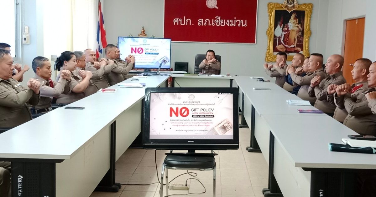 วันที่ 22 ธันวาคม ๒๕๖๖ เวลา 10.๐๐ น.พ.ต.อ.ชัชวาล แสงบุญ ผกก.สภ.เชียงม่วน ประชุมชี้แจงแจ้งประกาศของสถานีเรื่องการต่อต้านการรับสินบนและไม่รับของขวัญและของกำนัลของหน่วยให้ข้าราชการตำรวจในสังกัดถือปฏิบัติอย่างเคร่งครัด ณ ห้องประชุม สภ.เชียงม่วน