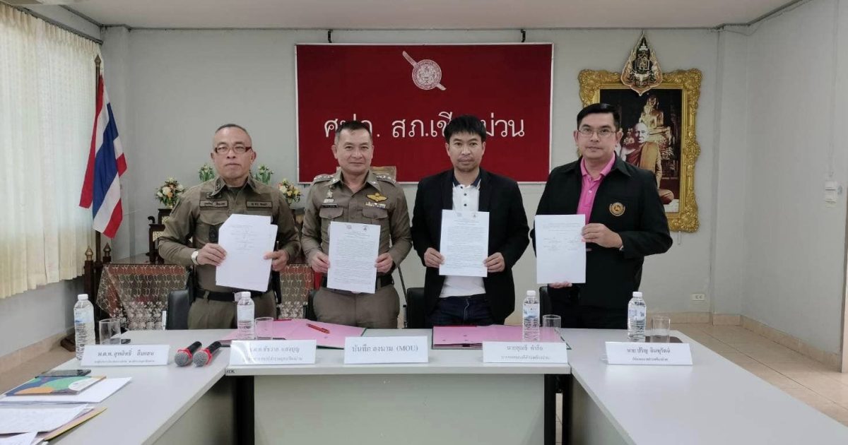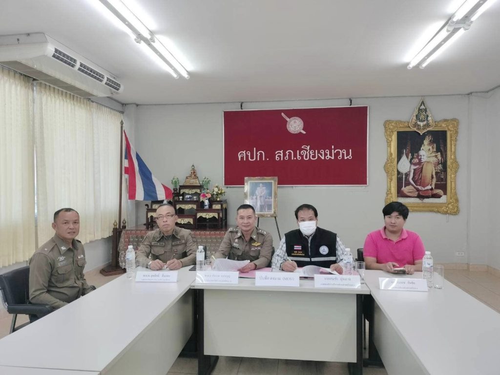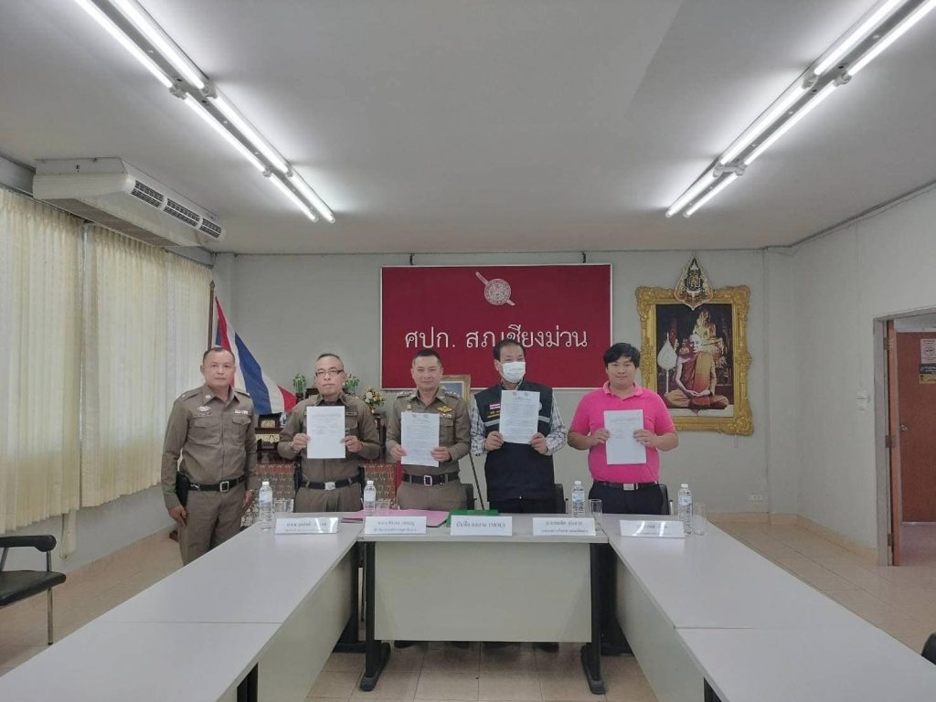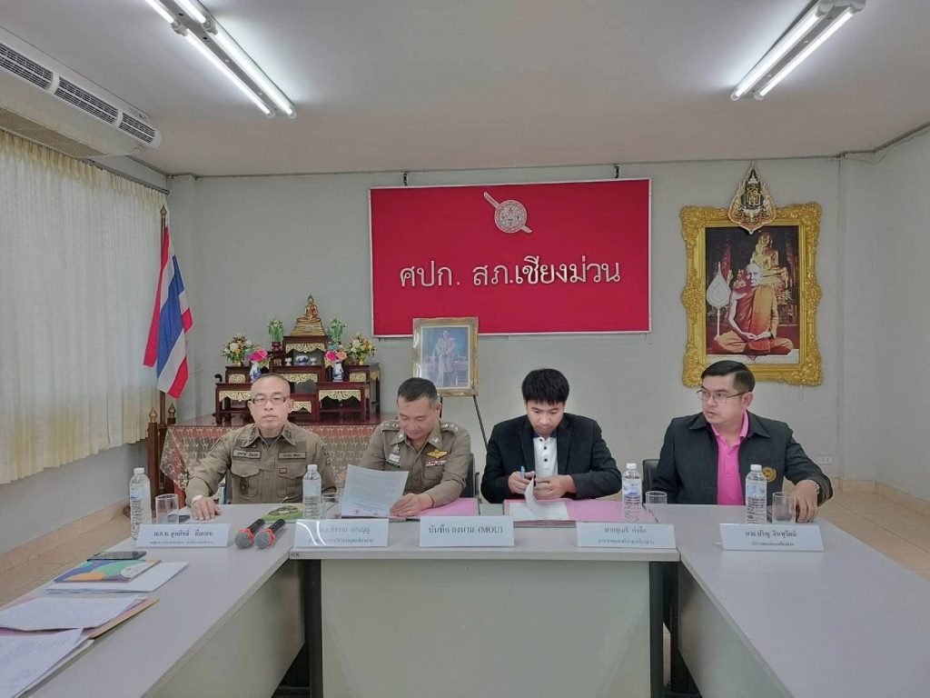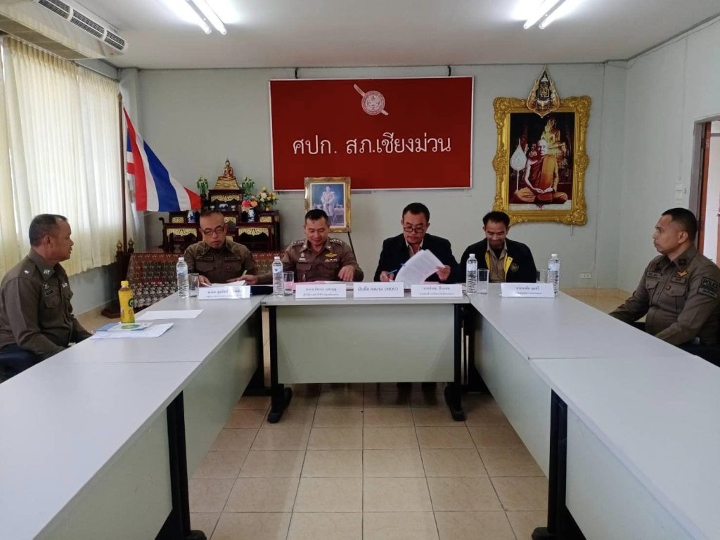วันที่ 26 ธ.ค.66 เวลา 11.00-12.00 น.พ.ต.อ.ชัชวาล แสงบุญ ผกก.สภ.เชียงม่วน ,พ.ต.ท.สุพสิทธิ์ สืบแสน รอง ผกก.ป.ฯ ,นายสุเมธี คำลือ นายกเทศมนตรีตำบลเชียงม่วน,นายปริญ อินทุรัตน์ ปลัดเทศบาลตำบลเชียงม่วน,นายสมชัย อุ่นตาล นายกองค์การบริหารส่วนตำบลบ้านมาง,นายวีระเดช กันชัย ปลัดองค์การบริหารส่วนตำบลบ้านมาง ,นายสังคม สืบแสน นายกองค์การบริหารส่วนตำบลสระ และนายธงชัย มูลศรี ปลัดองค์การบริหารส่วนตำบลสระ ร่วมกันบันทึกข้อตกลง ( MOU) ว่าด้วยความร่วมมือในการรักษาความสงบเรียบร้อยการรักษาความปลอดภัยในชีวิตและทรัพย์สินของประชาชนในท้องถิ่นและชุมชน ระหว่าง สถานีตำรวจภูธรเชียงม่วน และ เทศบาลตำบลเชียงม่วน ,องค์การบริหารส่วนตำบลบ้านมาง ,องค์การบริหารส่วนตำบลสระ ณ ห้องประชุมสถานีตำรวจภูธรเชียงม่วน