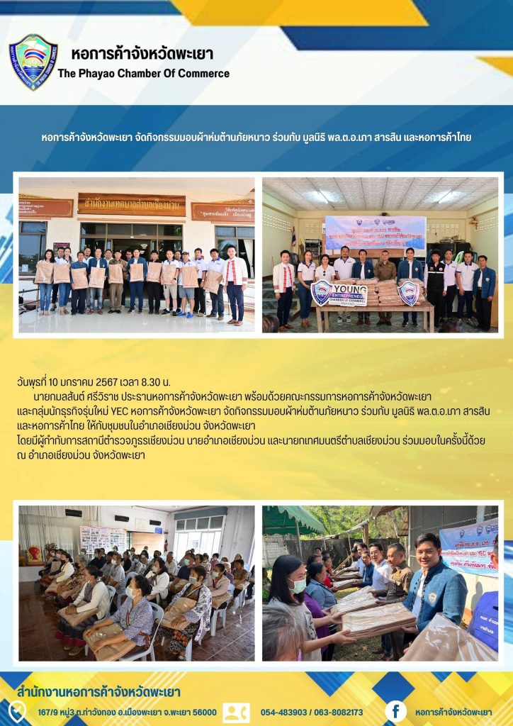 วันพุธที่ 10 มกราคม 2567 เวลา 8.30 น. นายกมลสันต์ ศรีวิราช ประธานหอการค้าจังหวัดพะเยา พร้อมด้วยคณะกรรมการหอการค้าจังหวัดพะเยาเเละกลุ่มนักธุรกิจรุ่นใหม่ YEC หอการค้าจังหวัดพะเยา จัดกิจกรรมมอบผ้าห่มต้านภัยหนาว ร่วมกับ มูลนิธิ พล.ต.อ.เภา สารสิน เเละหอการค้าไทย ให้กับชุมชนในอำเภอเชียงม่วน จังหวัดพะเยาโดยมีผู้กำกับการสถานีตำรวจภูธรเชียงม่วน นายอำเภอเชียงม่วน เเละนายกเทศมนตรีตำบลเชียงม่วน ร่วมมอบในครั้งนี้ด้วย ณ อำเภอเชียงม่วน จังหวัดพะเยา