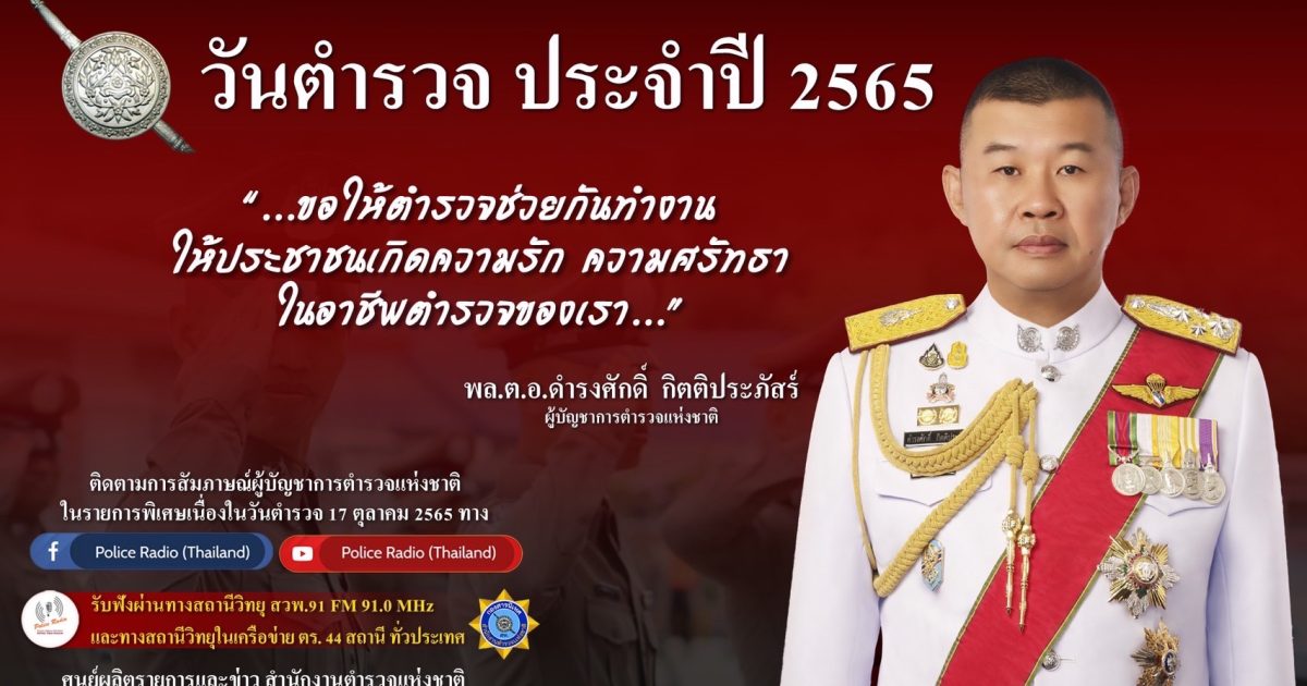 17 ตุลาคม วันตำรวจ ประจำปี 2565 “…ขอให้ตำรวจช่วยกันทำงานให้ประชาชนเกิดคจามรัก ความศรัทธาในอาชีพตำรวจของเรา…” พล.ต.อ.ดำรงศักดิ์ กิตติประภัสร์ ผู้บัญชาการตำรวจแห่งชาติ