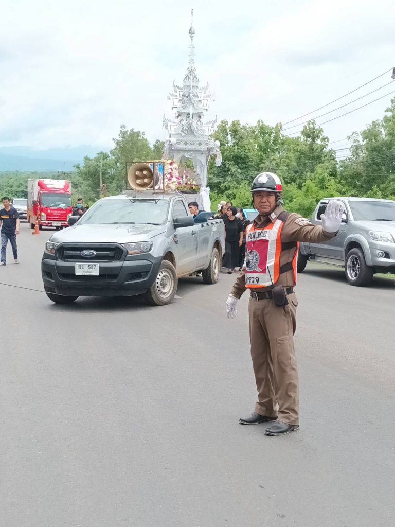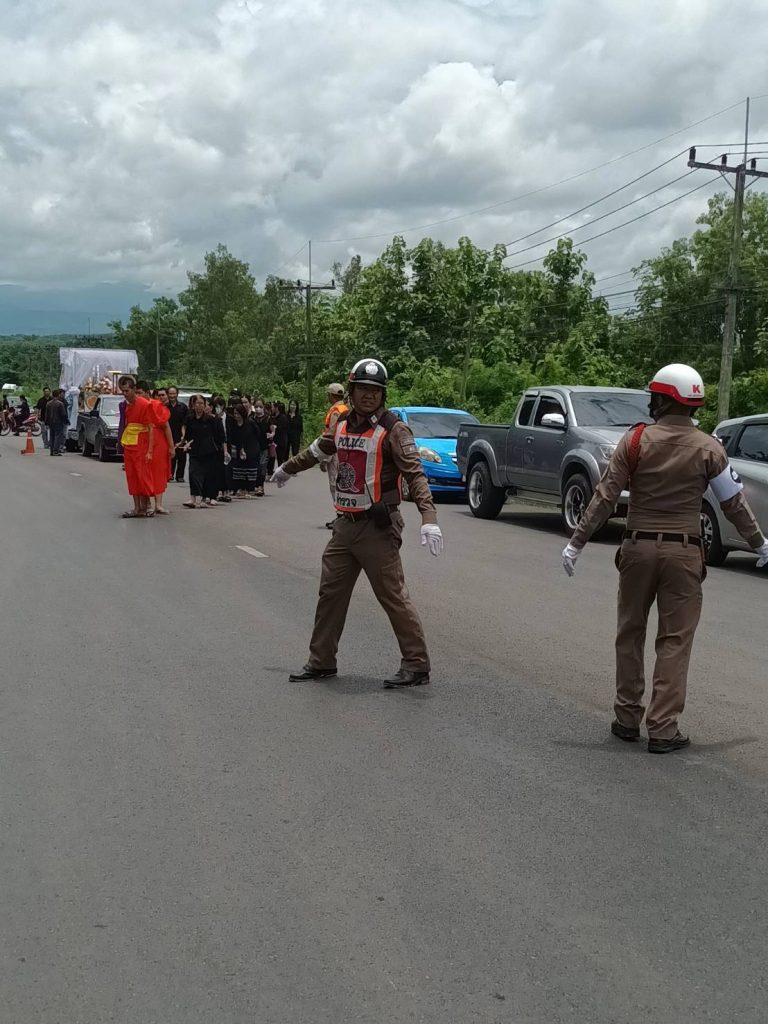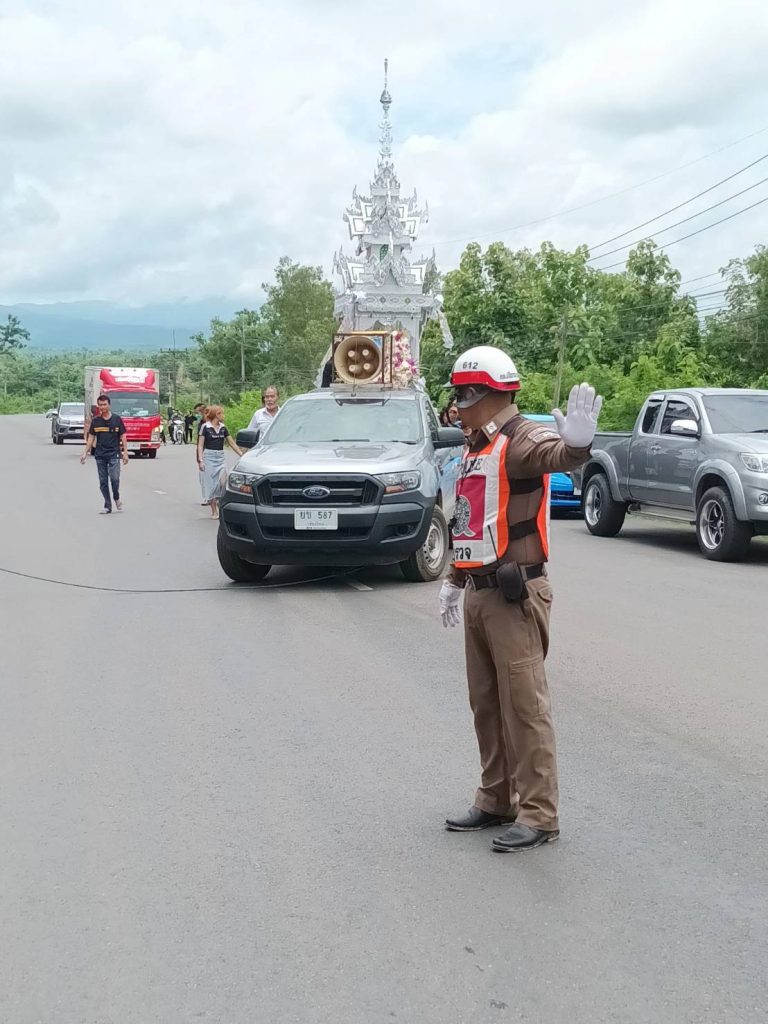วันที่ 15 ก.พ.68 พ.ต.อ.ชัชวาล แสงบุญ ผกก.สภ.เชียงม่วน สั่งการให้ ชุดจราจร สภ.เชียงม่วน อำนวยความสะดวกการจราจรในงานฌาปนกิจ เจ้าหน้าที่ตำรวจที่เสียชีวิต ตลอดระยะเวลาที่จัดงาน ณ สุสานบ้านท่าฟ้าใต้ ต.สระ อ.เชียงม่วน จ.พะเยา