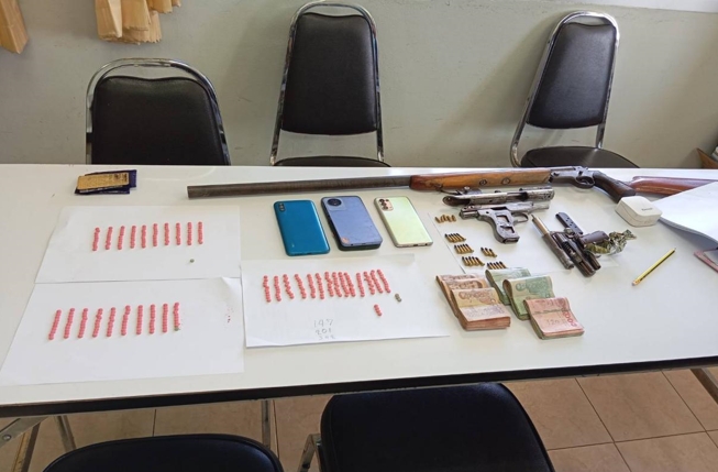 6.อาวุธปืนสั้นประกอบเองไม่มีหมายเลขทะเบียน จำนวน 2 กระบอก 1 กระบอกพบซุกซ่อนอยู่ในกล่องไม้ชั้นวางของด้านล่าง และอีก 1 กระบอกพบซุกซ่อนอยู่ในตระกร้าสีน้ำเงินของชั้นวางของภายในห้องนอนของนายอธิปไตยฯ