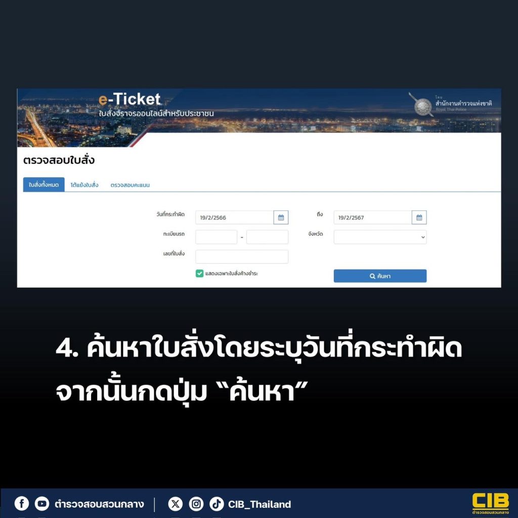 4. ค้นหาใบสั่งโดยระบุวันที่กระทำผิด จากนั้นกดปุ่ม “ค้นหา” (สามารถกรองข้อมูลด้วยเลขทะเบียนรถหรือหมายเลขใบสั่งได้)